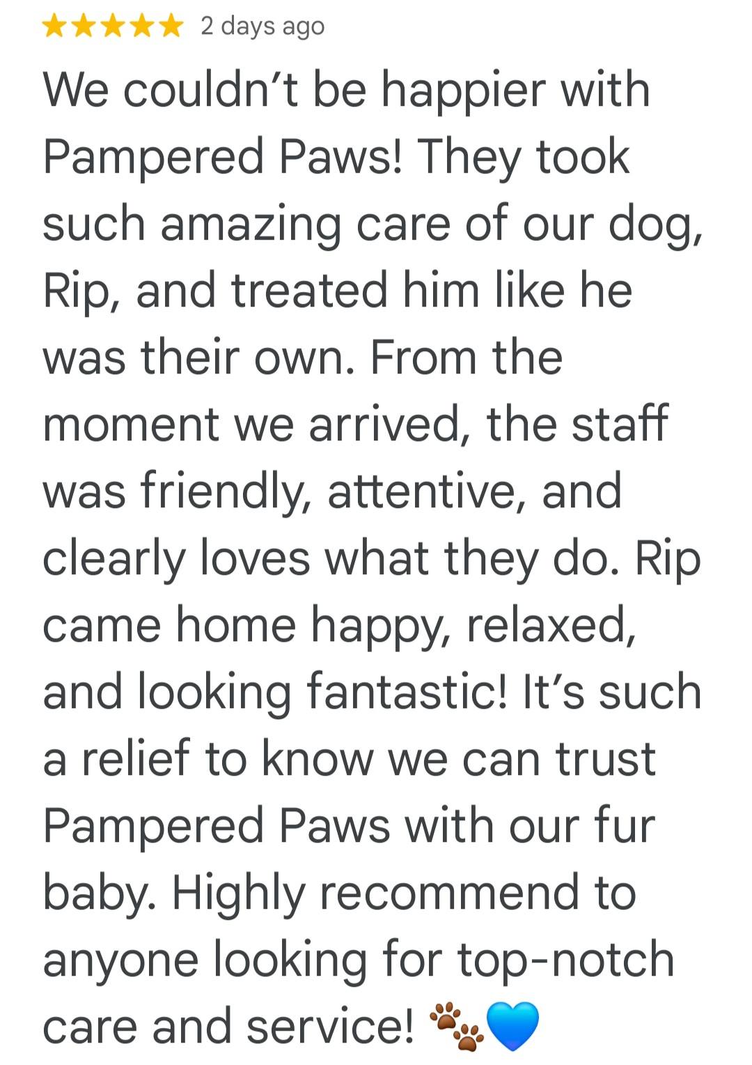 At Pampered Paws, we value client satisfaction. We always strive to make the best experience possible for you and your furry friend. Check out all our 5-Star Reviews on Google!